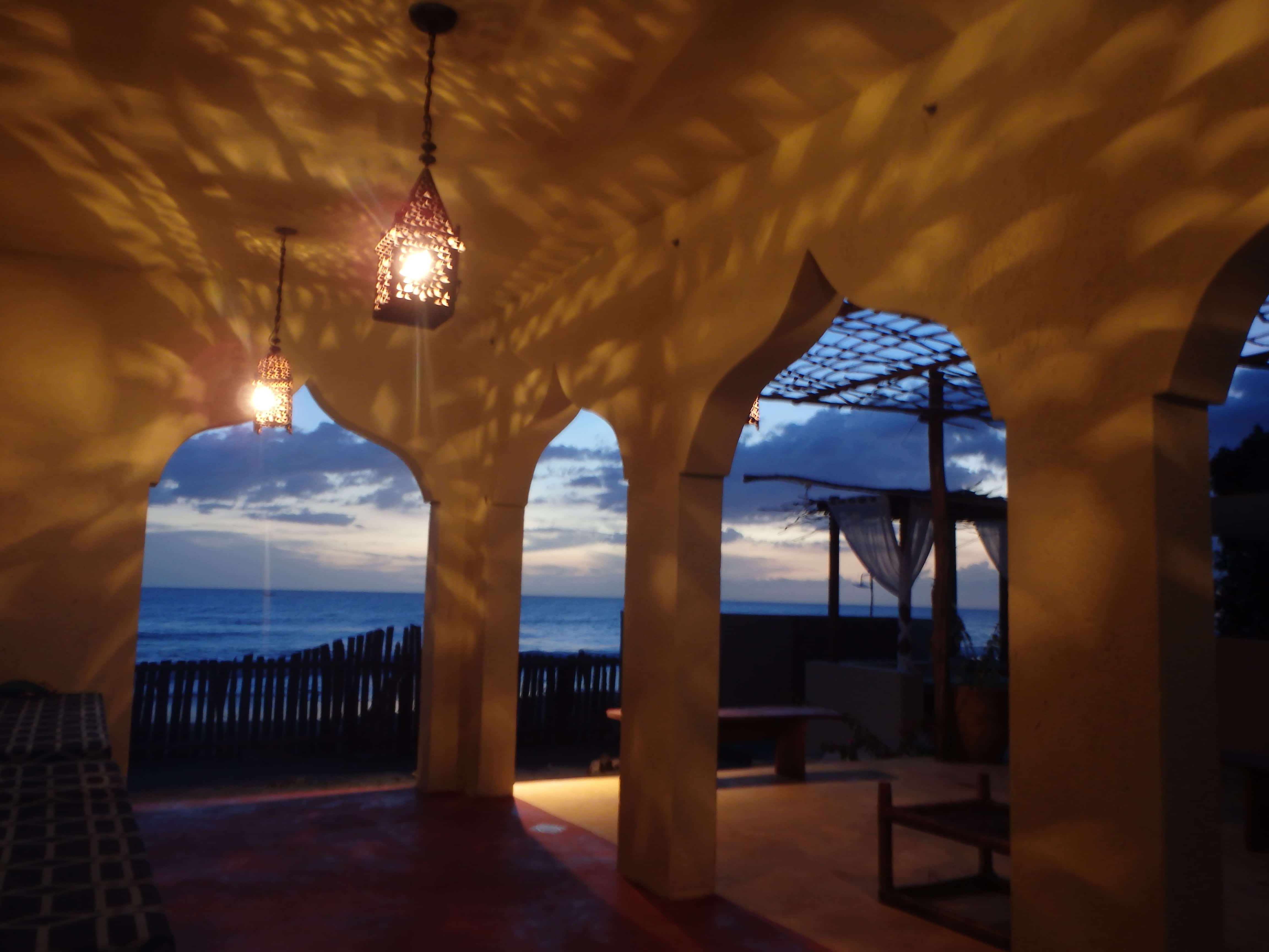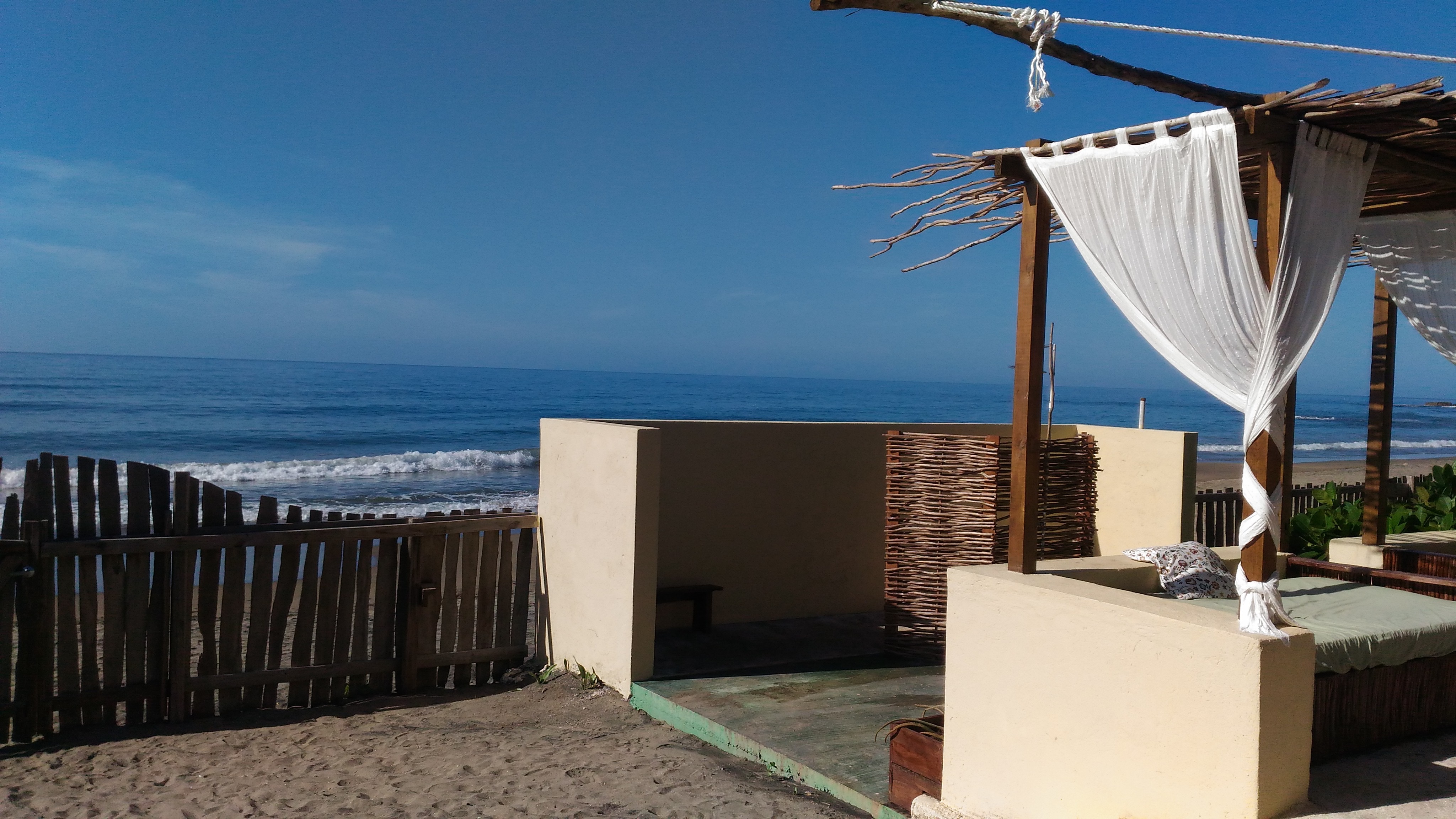 So my furnished tent is just that. One of those monster 2 room camping tents (the kind with two front doors that can be split with a curtain down the middle). There is a real bed in it, off the ground, some rugs, a couple of tables, and an LED camping lantern. The outdoor shower and the bathroom is across the sandy yard. My front stoop is sand. The Caribbean Sea is 25 steps away. I can hear the crashing waves from my bed. I can see the ocean from one of my mesh windows.